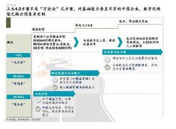 中国制造商能力参差不齐,现状复杂。要在数字化转型中成功获取最大的价值,需要的不是“万金油”式的解决方案,而是基于公司个体能力与业务需求量身定制的工业4.0路径(见下图)。