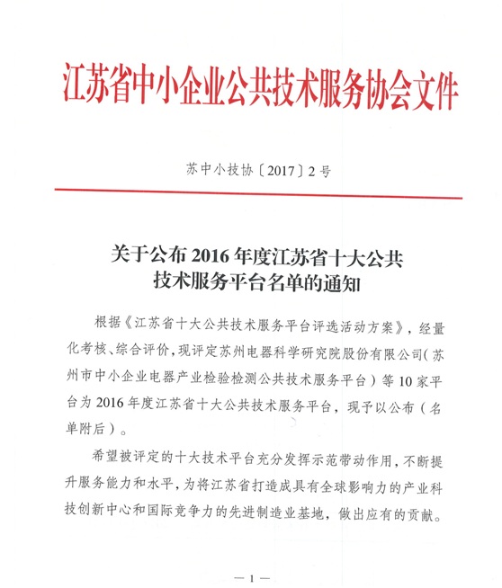 本次活动根据《江苏省十大公共技术服务平台评选活动方案》,经量化考核、综合评价,最终评选出包括苏州电器科学研究院(苏州市中小企业电器产业检验检测公共技术服务平台)在内的10家平台为2016年度江苏省十大公共技术服务平台。