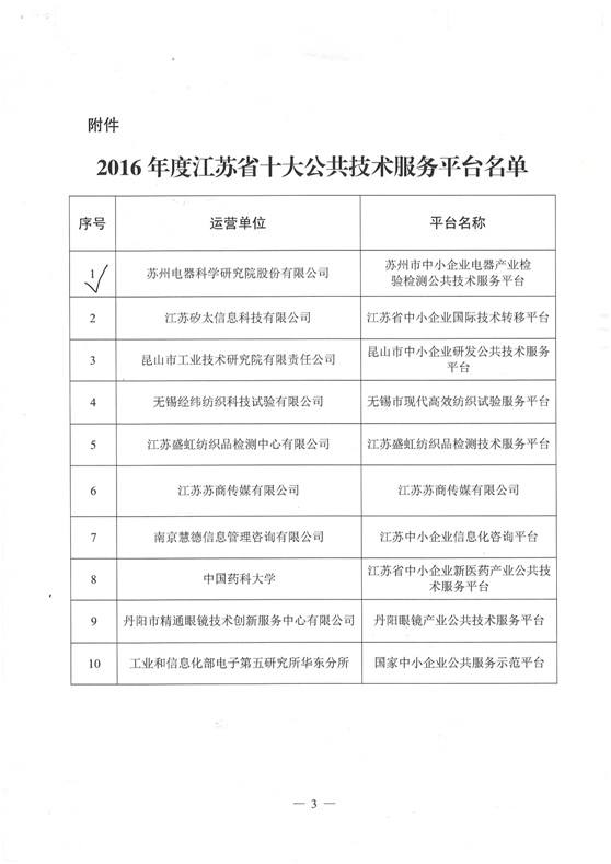 苏州电科院入选2016年度江苏省十大公共技术服务平台