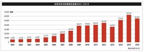 风电在电力需求中所占的比例(渗透率)继续提高,丹麦达到了40%, 紧随其后的是乌拉圭,葡萄牙和爱尔兰,它们都超过了20%, 西班牙和塞浦路斯都达到20%, 德国16%。 一些大的电力市场如中国、美国和加拿大的风电渗透率分别达到4%、5.5%和6%。全球风能理事会的五年市场预测显示2017年全球风电年新增装机有望达到60GW, 到2021年新增装机容量将增至75GW, 使累计容量到2021年超过800GW。