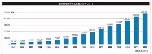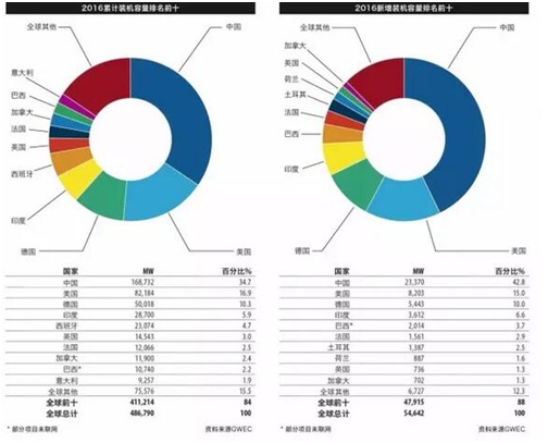 全球风能理事会在印度新德里发布《全球风电报告:年度市场发展》。《报告》显示,2016年中国风电累计、新增装机容量均居全球第一。2016 年全球风电新增装机容量超过 54GW, 其中 9 个国家的装机容量超过10GW,累计容量达到 486.8GW,累计装机容量增长 12.6%。