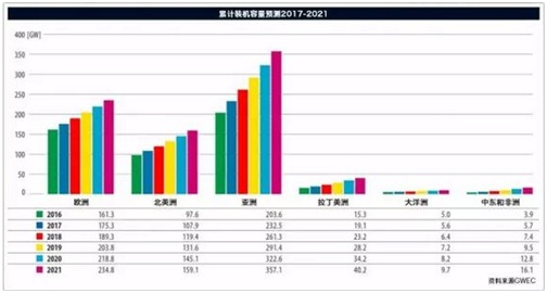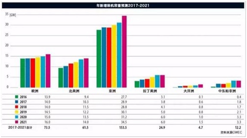 在北美洲,市场增长的基础非常强劲。 欧洲发展稳健, 欧洲海上风电的强大价格降幅如同给了欧洲风电发展一剂“强心针” ,为欧洲迈向2020年可再生能源发展和温室气体减排的目标提供了一个强大推动力。 欧洲将继续引领全球海上风电市场,而海上风电的低价将吸引全球特别是亚洲和北美的政策制定者关注海上风电。