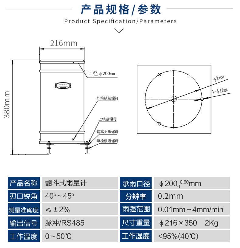 容易清洗的功能。脉冲转 485 信号输出,可直接读取降雨量,无需二次计算,简单方便。