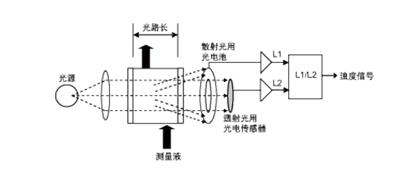 本模块通过油水分离器分离出的排放水样进入该装置的光电传感器的测量室。测量水样对红外产生的透射光和散射光的信号,经过微处理器的采集和处理,测出水样中的含油量,并在液晶面板上显示。如果排放水中的油浓度超过设定的报警点值(报警值可在面板中设定),报警指示灯点亮,在设定的延时时间后相应的继电器动作,阻止超浓度水向舱外排放。其原理示意如图所示。